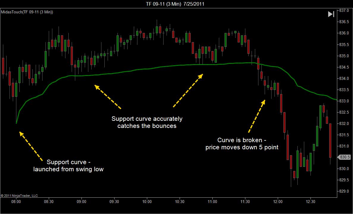 In the sample below, TF futures is shown on a 3 minute chart with a MIDAS support curve. This is normal MIDAS behavior - capturing several pullbacks, and when finally crossed, pointing to a strong downturn. Even after the support line was broken, price returned to retest it as resistance.