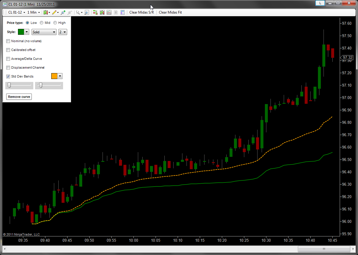 Midas Advanced includes new indicators for MIDAS analysis, which expand its capabilities. Midas Standard Deviation Bands is a powerful new tool, which can be used for both sideways and trending markets.