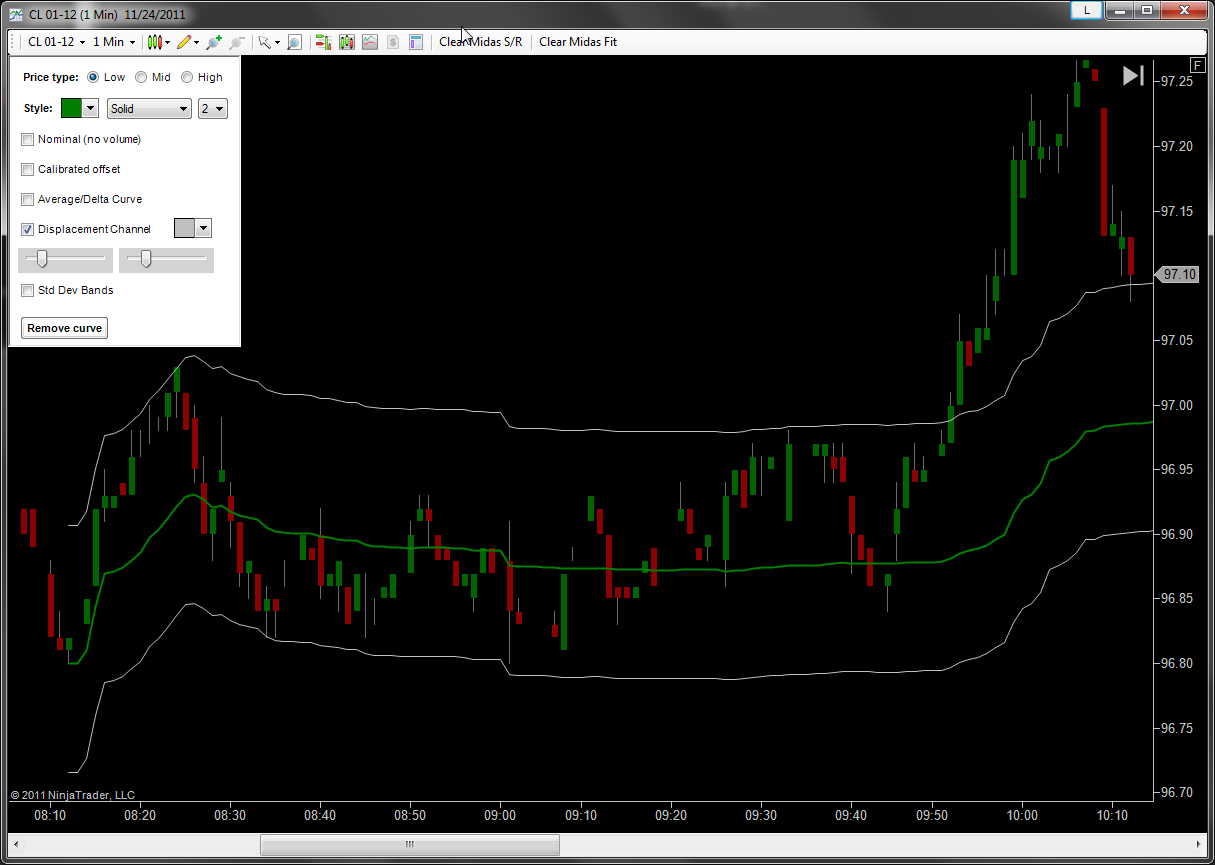 To create Midas Displacement Channels, first launch a normal MIDAS curve. Then from the dropdown, enable "Displacement Channels", and adjust sliders to move the channel curves up or down. They should be moved to the first pullback, and future price will often interact with the channel.